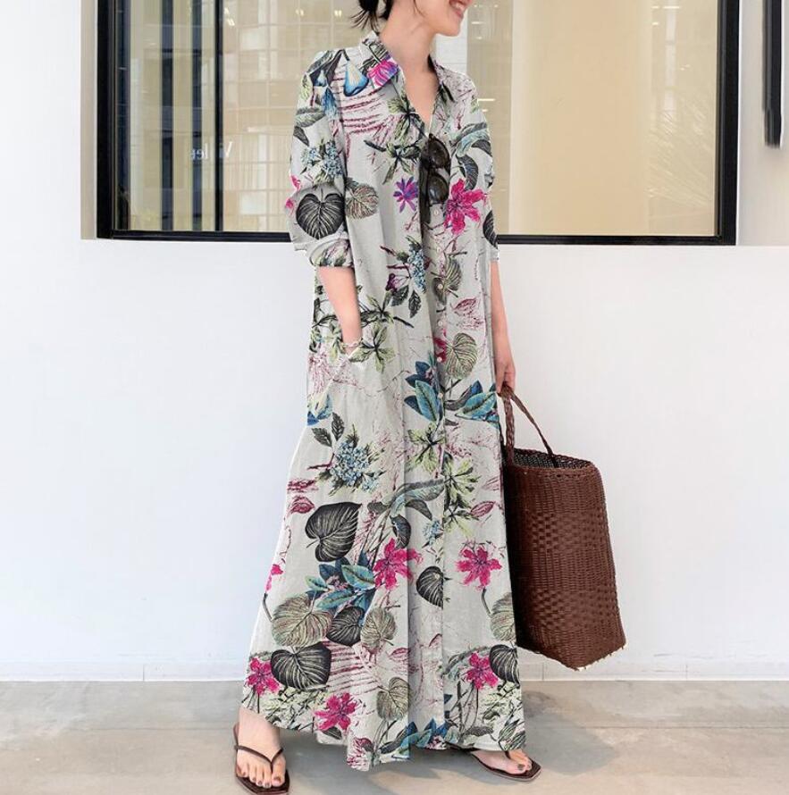 - 新品 / オリジナル シャツワンピース 綺麗 プリント柄 綿麻 長袖 大きいサイズ マキシ丈シャツワンピース 大人 ロングワンピース/バラ色