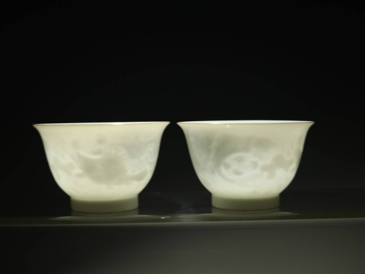 - 【博古斎】 古陶磁 中国・清時代 雍正年制【白釉暗刻魚藻紋杯一対】 古賞物 磁器 古磁器 古置物 古美術品 唐物 LOT-07131