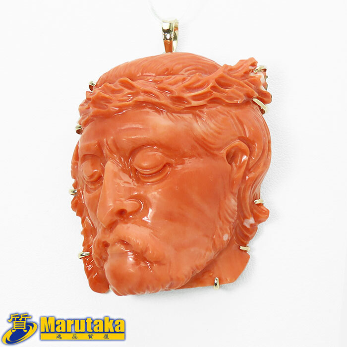 > 【14K枠 サンゴ ペンダントトップ】鑑別書付 珊瑚 赤橙色 コーラル 月桂冠 アポローン アポロン 月桂樹の冠 彫刻 中古 23k389-2