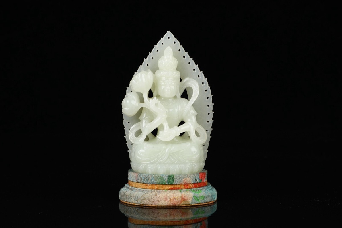 - 「清時代 和田玉 白玉彫り 蓮花観音」極細工 擺件 中国古賞物 古美術 旧蔵出