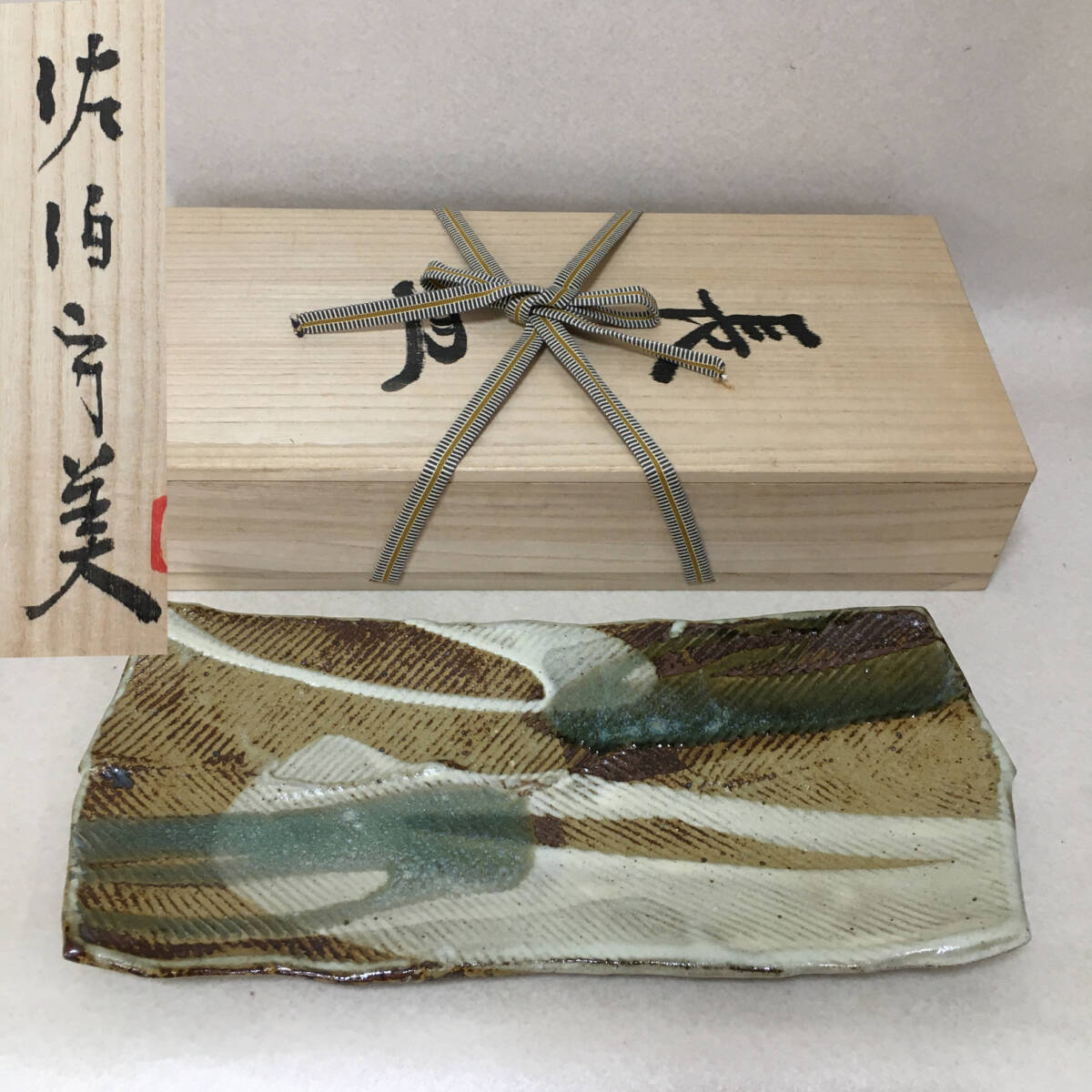 - 【E059】未使用 佐伯守美 1994年 長皿 共箱 黄布 益子焼 盛皿 飾皿