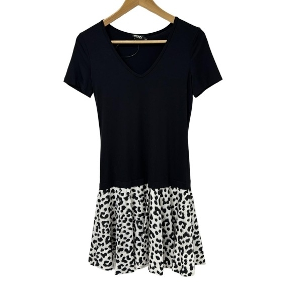 - ダナキャラン DKNY サイズXP - 黒×白 レディース Vネック/半袖/ひざ丈/豹柄 美品 ワンピース