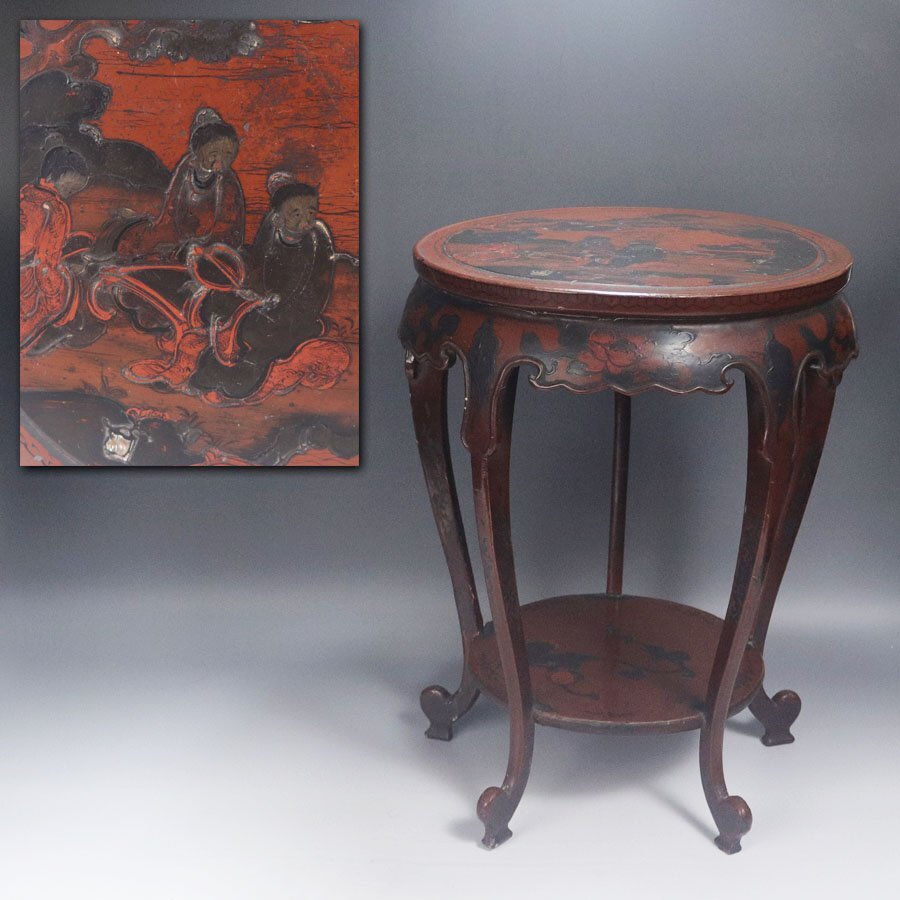 - 《源》【即決・送料無料】《江戸期》古琉球漆芸 朱漆 唐人物文 時代物 丸形六足高卓・中央卓