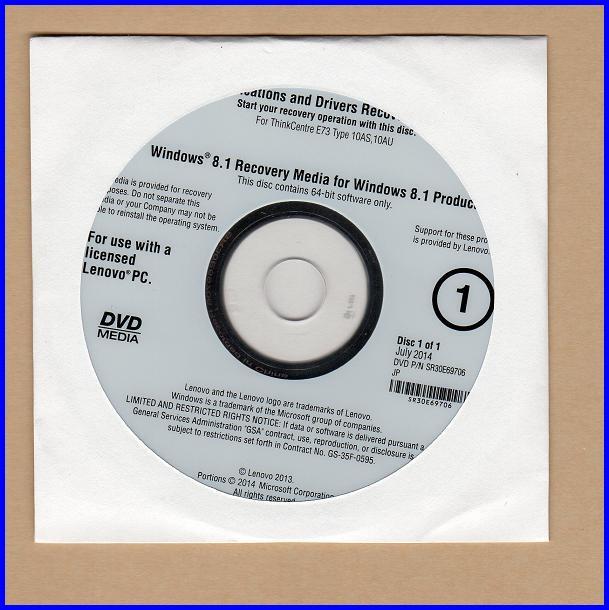- ■Lenovo ThinkCentre E73■Windows8.1 Pro リカバリDVD3枚組■OS, Applications, Drivers■009W■ ・・未開封で,取説も付いています