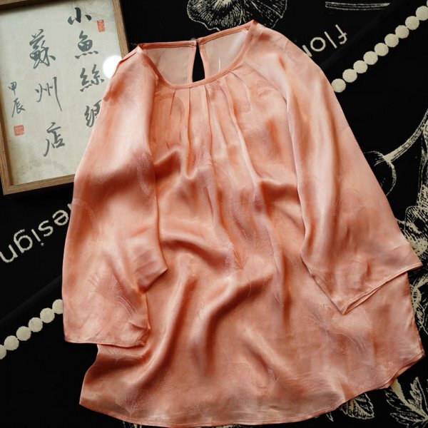 - 2507シルクシャツブラウス天然エアコン涼しいシルク100%丸首着やすい優雅素敵柄シンプルピンク色