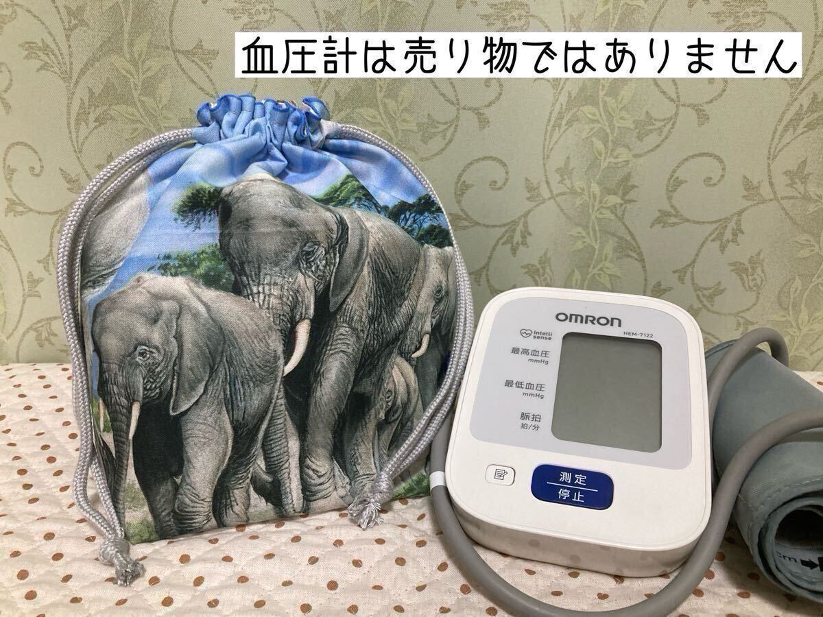 > 巾着 巾着袋 上腕式血圧計(置き型)サイズ 血圧計入れ 底板付(ボール紙) レア柄 ゾウ サイ ハンドメイド《血圧計は撮影用です》
