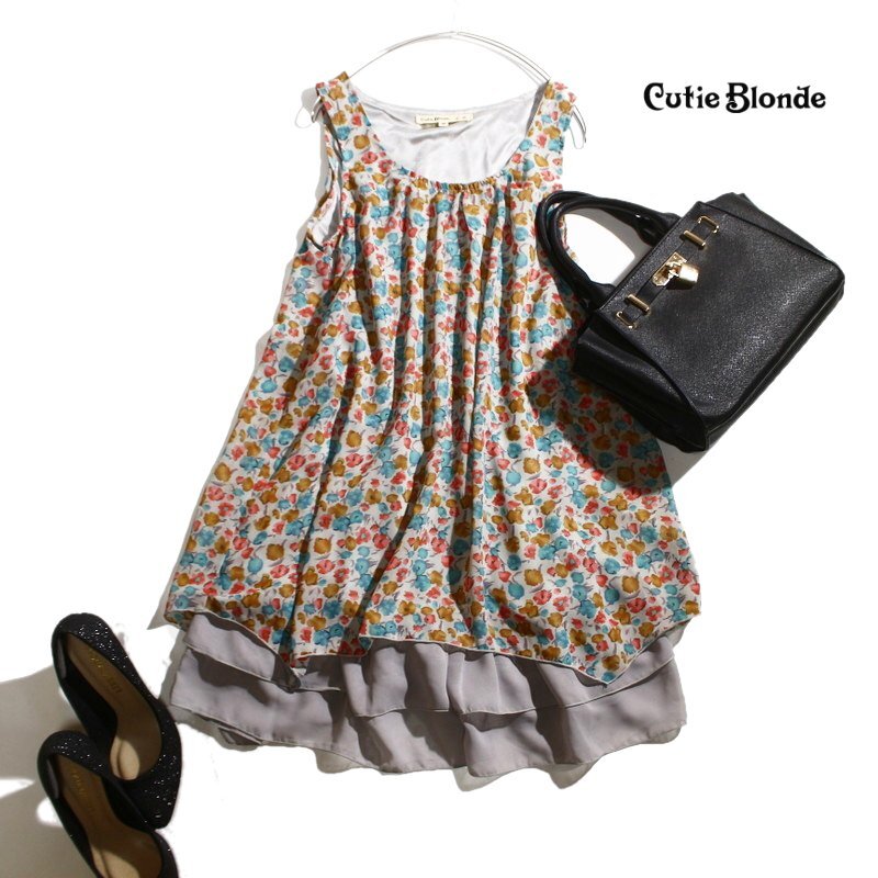> 美品 キューティブロンド cutie blond 株) ワールド 春 夏 イラスト フラワー プリント 柄 ノースリーブ シフォンワンピース M グレー 花柄