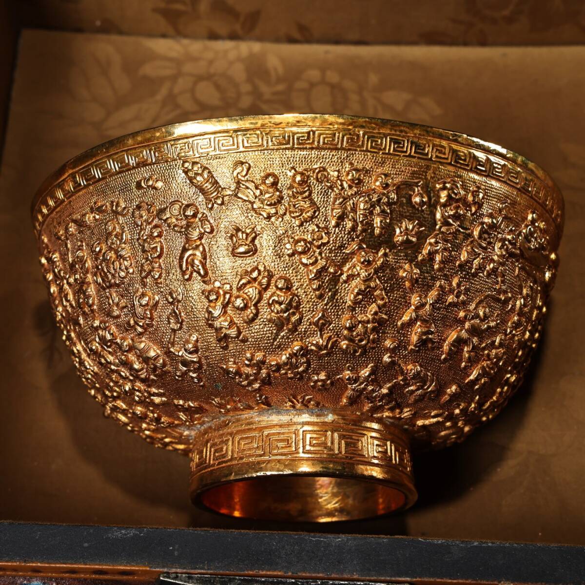 - ▽鴻▽ 銅製 塗金 百子紋 茶碗 箱付 置物 賞物 古賞物 古董品 時代物 稀少珍品 中国古玩 中国古美術