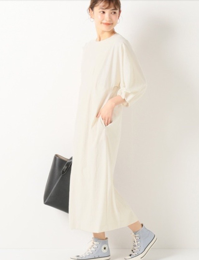 > IENAイエナ リランチェボリュームスリーブワンピース◆ロング丈ギャザーきれいめ トゥモローアローズplageジャーナルスピック ホワイト系