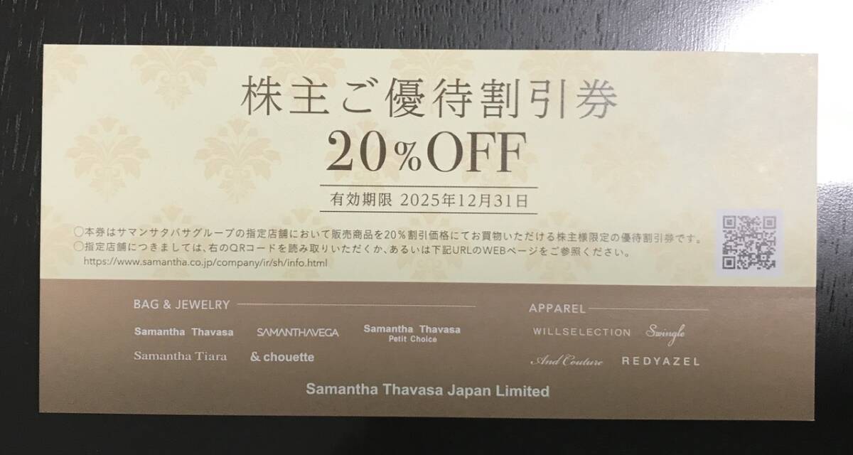 > 【株主優待】サマンサタバサ、20%割引券、1枚、2025年12月31日まで有効。送料110円。