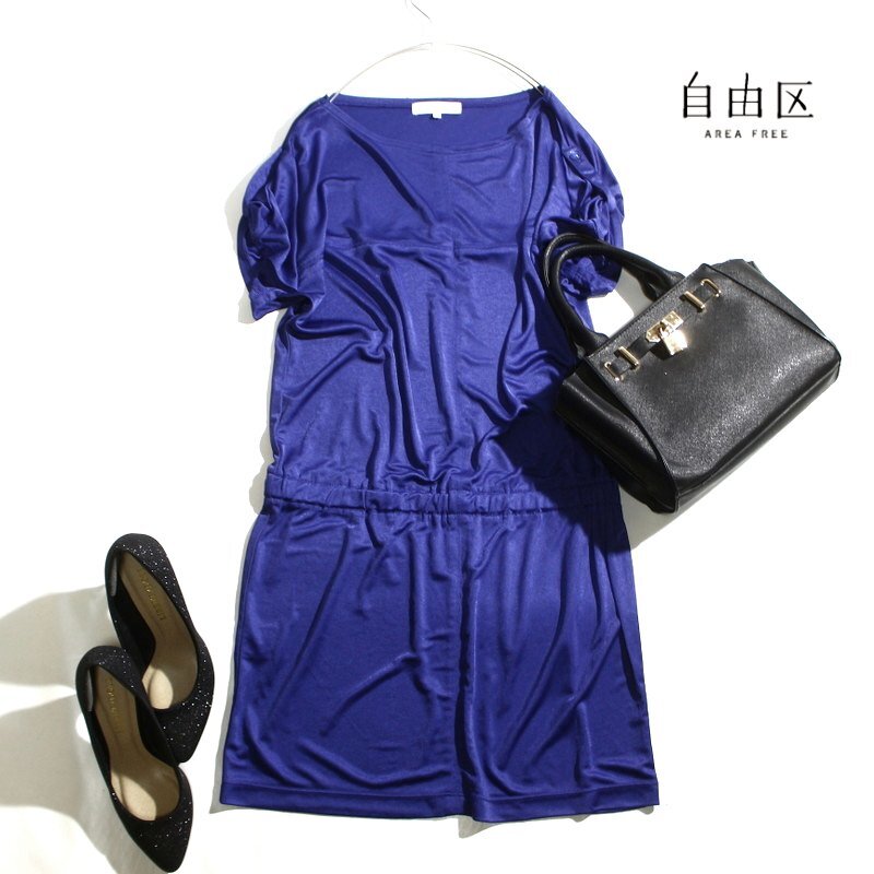 - 美品 ジユウク 自由区 株) オンワード樫山 夏 艶 ストレッチ つるん 半袖 ジャージ― ワンピース 9号 38 ブルー 青 ミセス プルオーバー