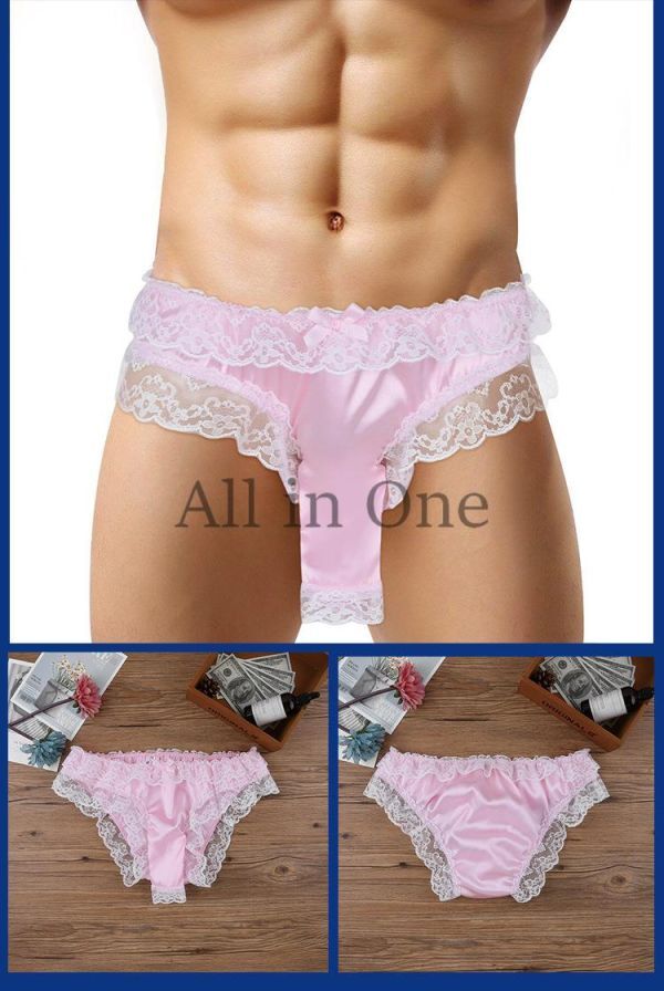 > 180-50-10 メンズ 光沢サテン 竿付き フリル メイド風【ピンク,M】男性 下着 セクシー ブリーフ サオ付き パンティ ゲイ ショーツ .2