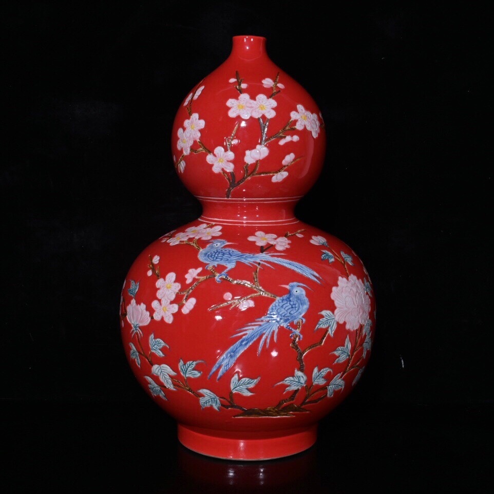 - 蔵友旧蔵出 明 宣德年製款 紅釉 五彩 花鳥紋 ひょうたん瓶 稀少珍品 貴重品 古陶瓷品 置物 古賞物 中国古玩 中国古美術品