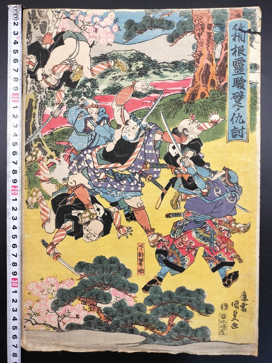 - 江戸期/真作 歌川国貞「箱根霊験躄ノ仇討」本物浮世絵木版画 武者絵 合戦絵 錦絵 大判 裏打ち