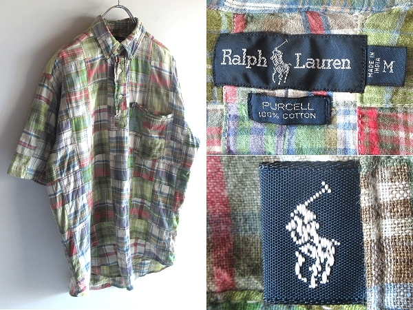 - 希少 90sビンテージ Ralph Lauren ラルフローレン PURCELL ポロポニーロゴピスネーム クレイジーパッチワークシャツ プルオーバーシャツ M
