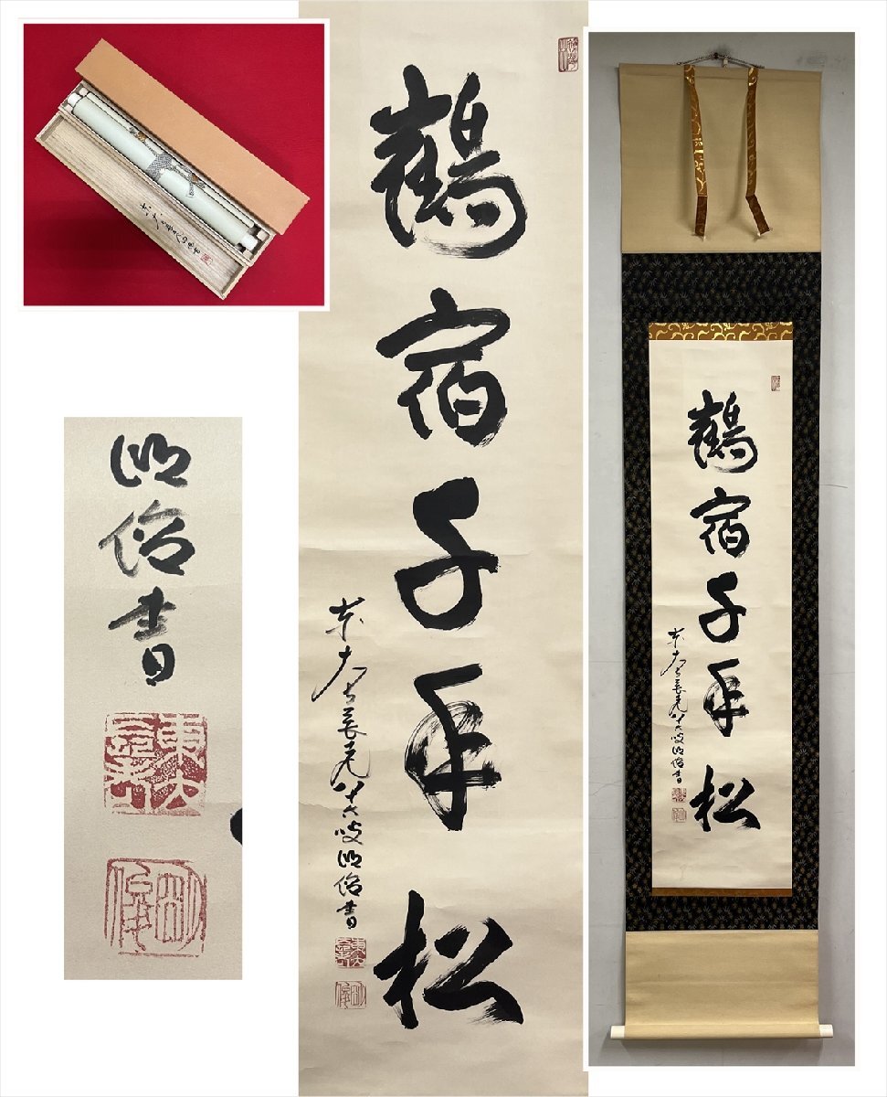 - 【千寿】東大寺203世別当 管長 狭川明俊 鶴宿千年松 一行書 紙本 d1619◆箱 在銘 季節掛 茶掛 掛軸 掛物 茶道具 100042164