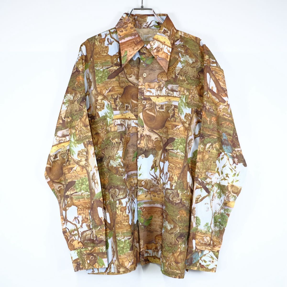 - 1970s ビンテージ 総柄ポリシャツ 動物 大地 ジャングル アート イラスト ヒッピー 古着屋 USA製 デザイン
