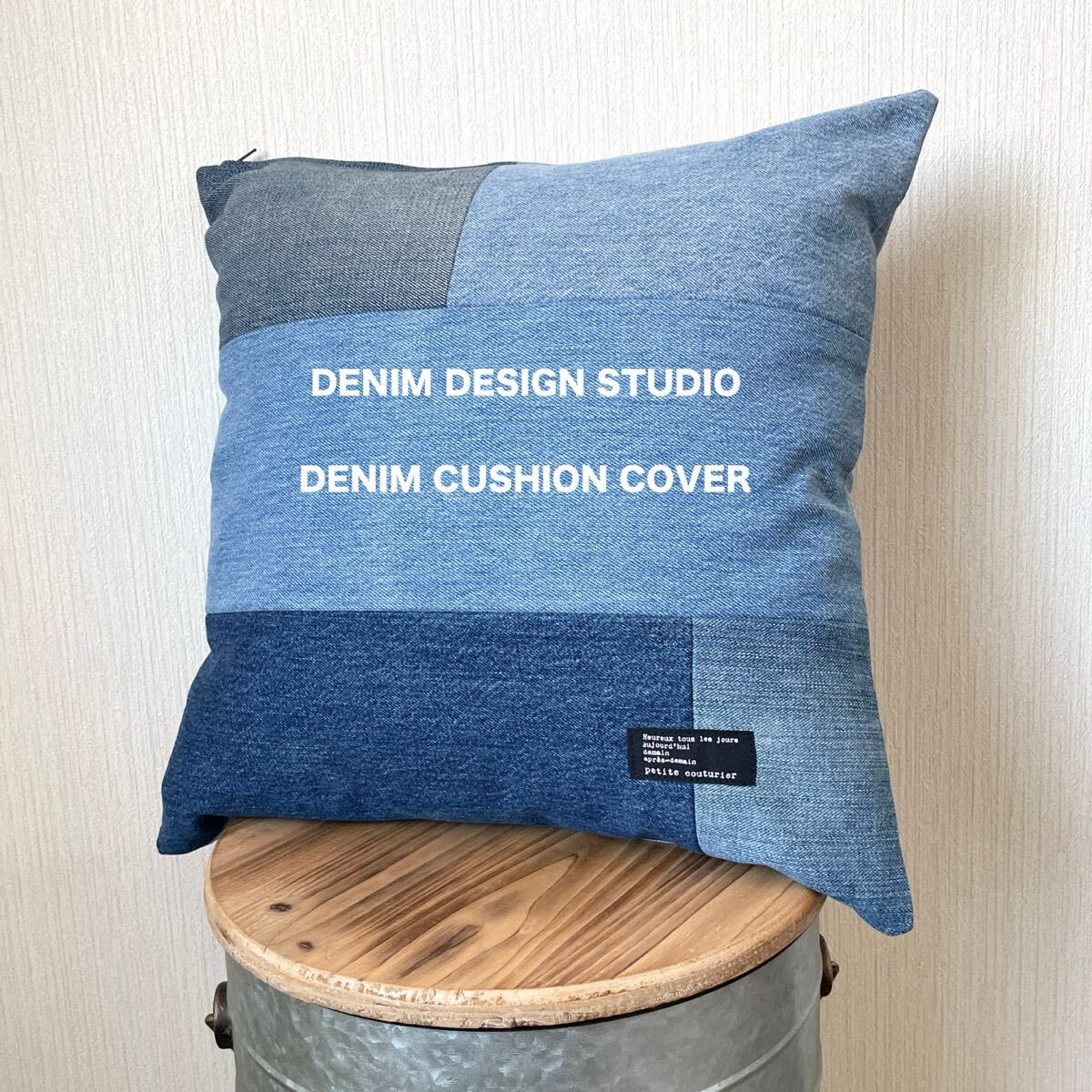 - 【デニムクッションカバー】ネイビーブルー 紺色 45cm用 バンドメイド インテリア雑貨 ジーンズリメイク 3段パッチワーク
