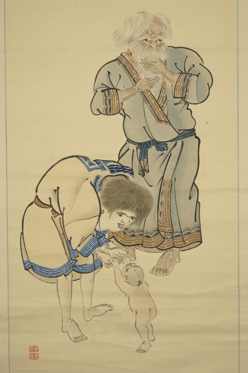 - 【真作 敦賀旧家伝来】掛軸「千島春里 アイヌ親子像」松前 蝦夷 風俗画 絵画