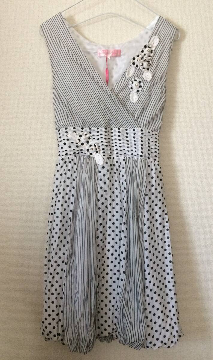 - ★★タグ付き 未使用★★ストライプ×ドット 白×黒 バルーンスタイル ミモレ丈 ワンピース レアデザイン