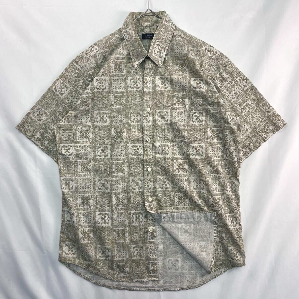 - US Vintage 90s ARROW コットン ポリエステル ボタンダウン くすみカラー エスニック 民族 幾何学模様 プリミティブ 総柄 デザインシャツ