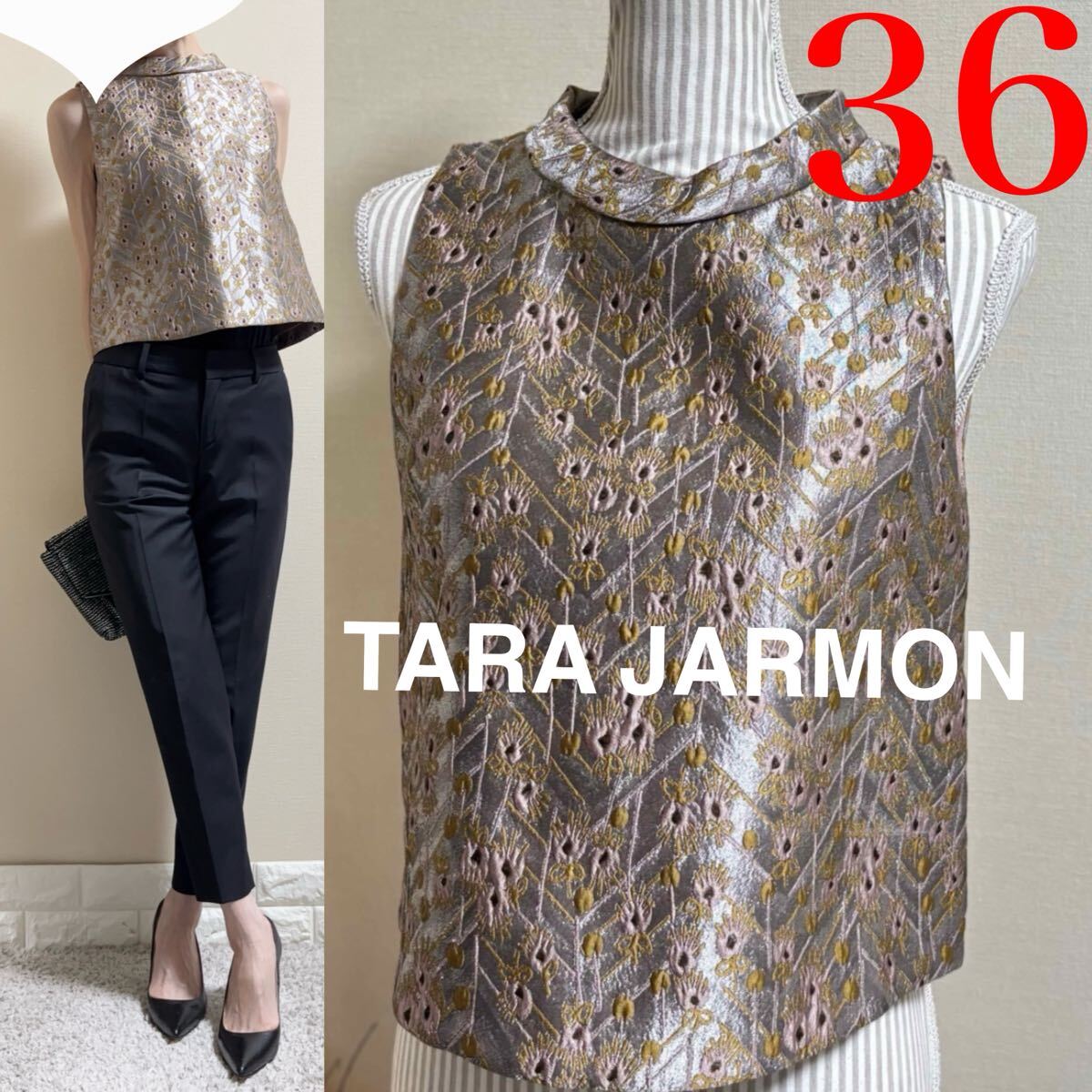 > 美品!タラジャーモン TARA JARMON 定価39,000円 刺繍 ロールカラー タフタ ブラウス プルオーバー S 36 ベージュピンク フラワー
