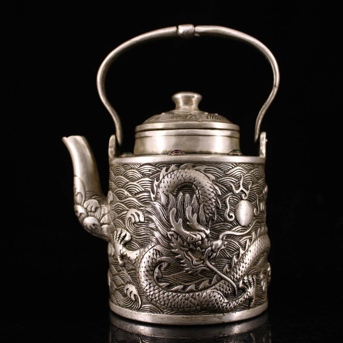 - 蔵友旧蔵出 銅製 銀鍍 寶石嵌 雲龍戲珠紋 提梁酒壺 希少珍品 貴重品 置物 古賞物 密宗密教 供養品 仏教美術品