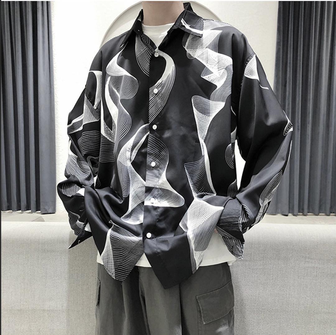 - 長袖 シャツ 柄シャツ ルーズフィット カジュアルシャツ ブラック Lサイズ