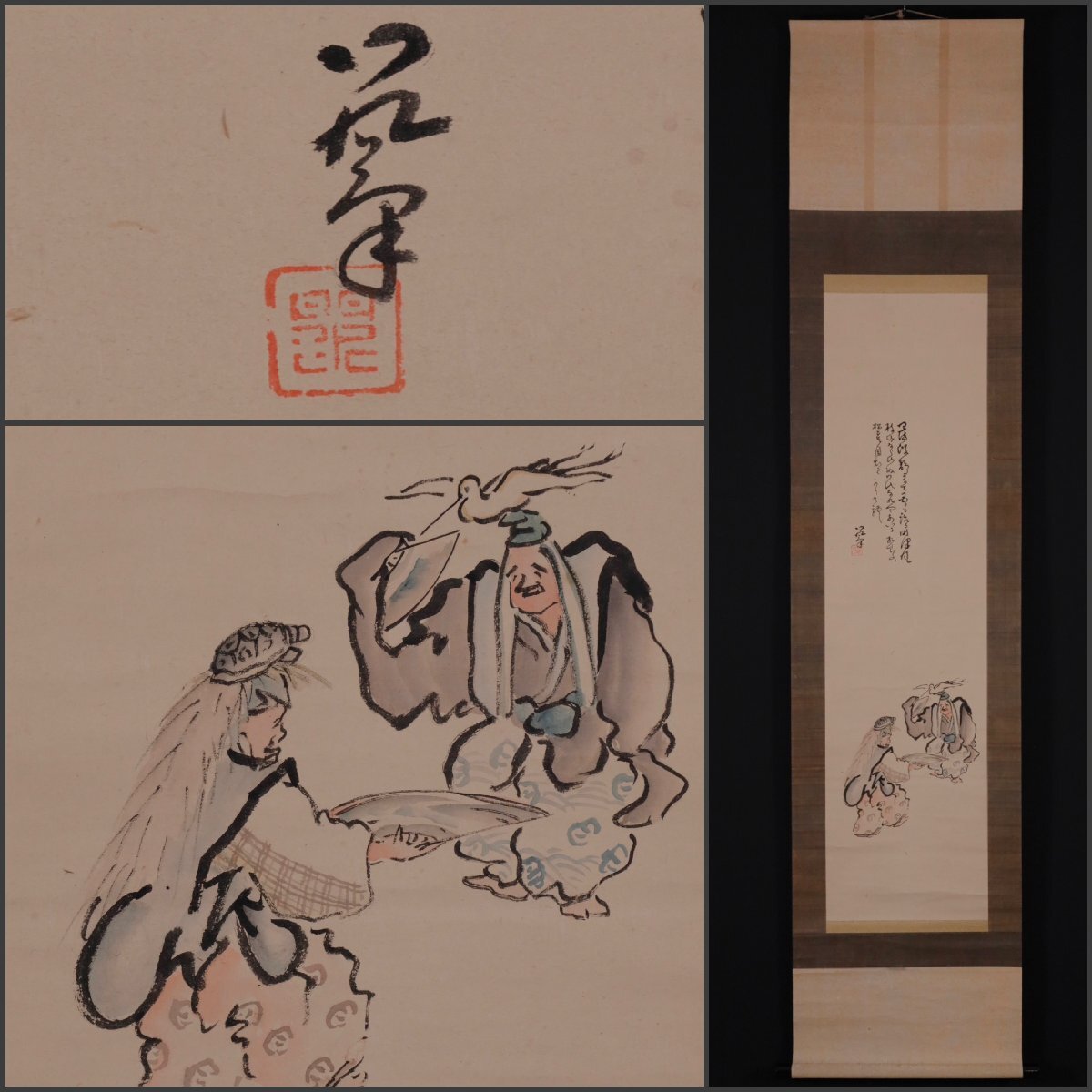 - 【模写】吉】12699 伊勢門水 能画 鶴亀図 能楽 和泉流狂言師 尾張国 名古屋 愛知県の人 物語絵 茶掛け 茶道具 掛軸 掛け軸 骨董品