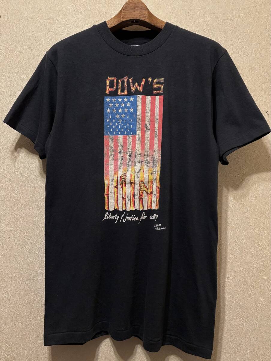 - バック両面プリントUSA製80sビンテージHanes-POW'S星条旗×監獄TシャツM袖/裾シングル良質50/50黒US製80年代1980sオールド囚人プリズナーPW