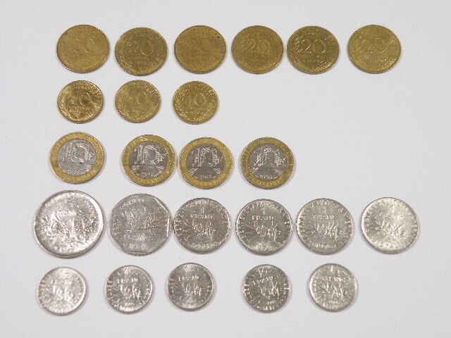 - ◎ フランス 硬貨 10フラン(1989~) 5フラン(1971) 2フラン(1981) 1フラン(1973~) 1/2フラン(1968~) 20サンチーム 10サンチーム 計24枚