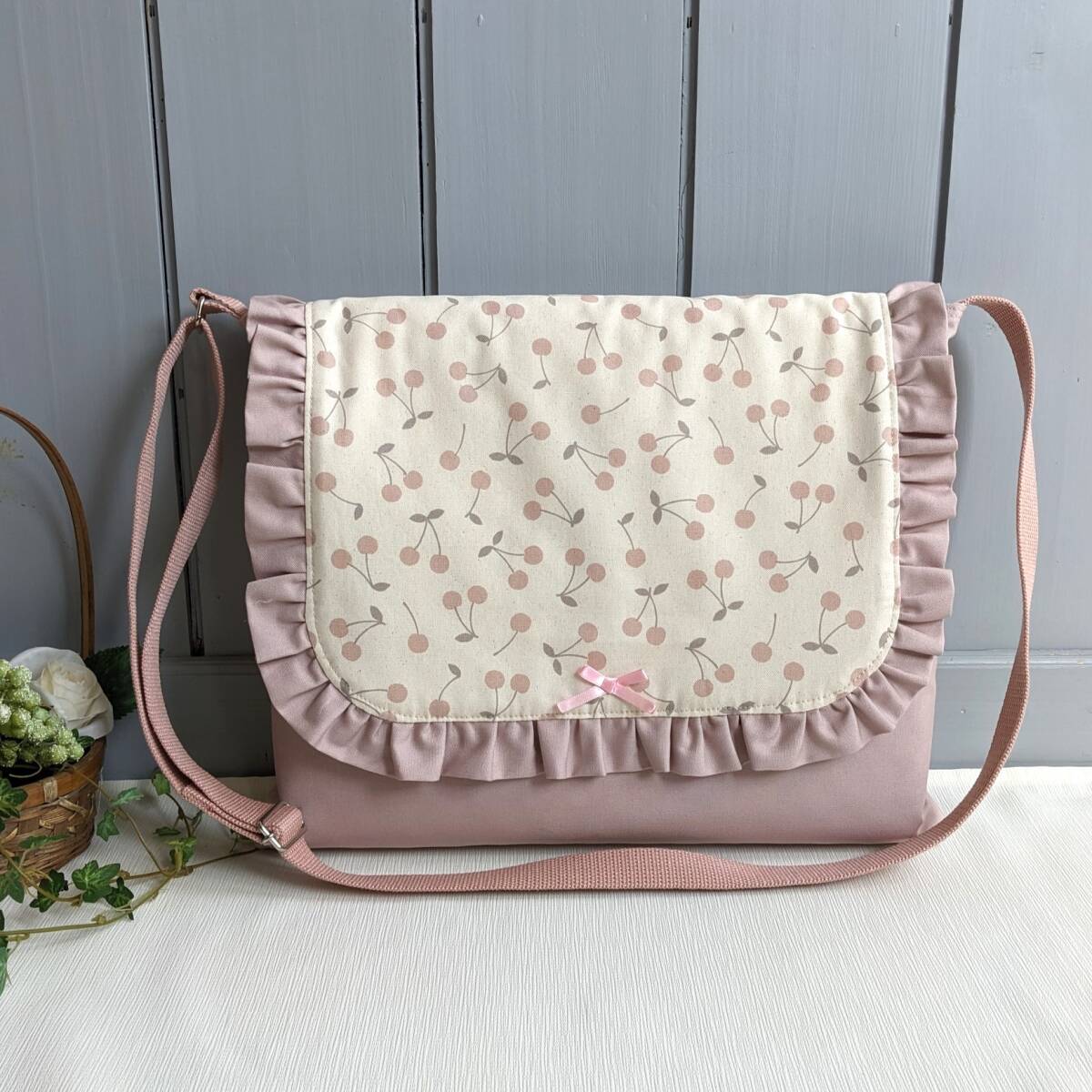 - 【完成品】フタ付きショルダー図書バッグ くすみピンク×チェリーキナリ 斜め掛けナナメ 絵本 フラップ蓋 入園入学通園通学★ハンドメイド