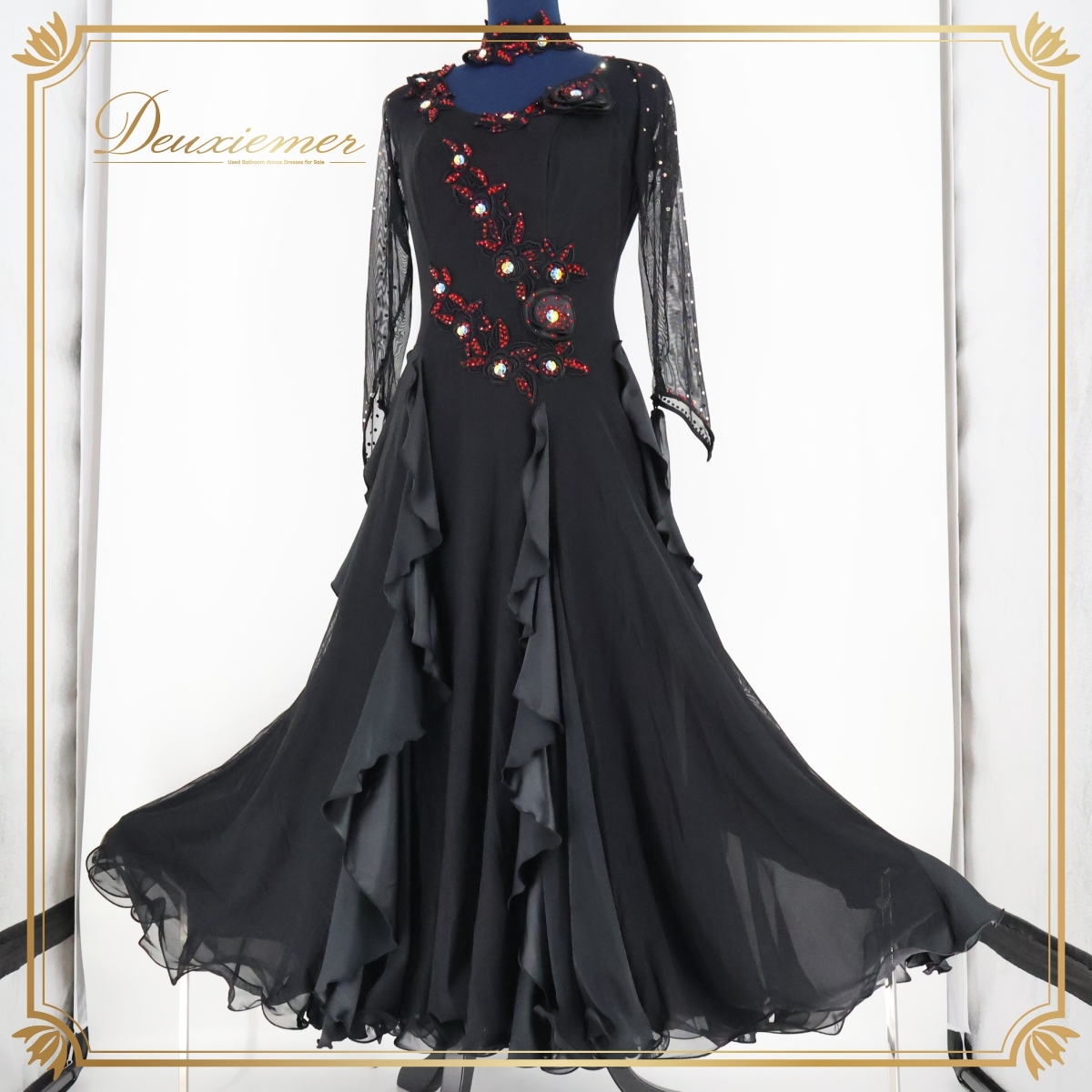 - 社交ダンス 衣装 スタンダード スタンダードドレス セキネ SEKINE 日本製 ワンピース フロート ブラック系 黒 レース フリル デモ 競技