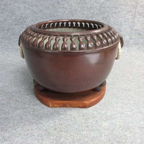 > 底款 幸山 宣徳銅 瓢箪耳 環付 瓢箪透縁 丸火鉢 [B26920] 高さ22.5cm 直径28cm 唐銅製 瓢箪尽 紫銅 瓶掛 手焙り 茶道具