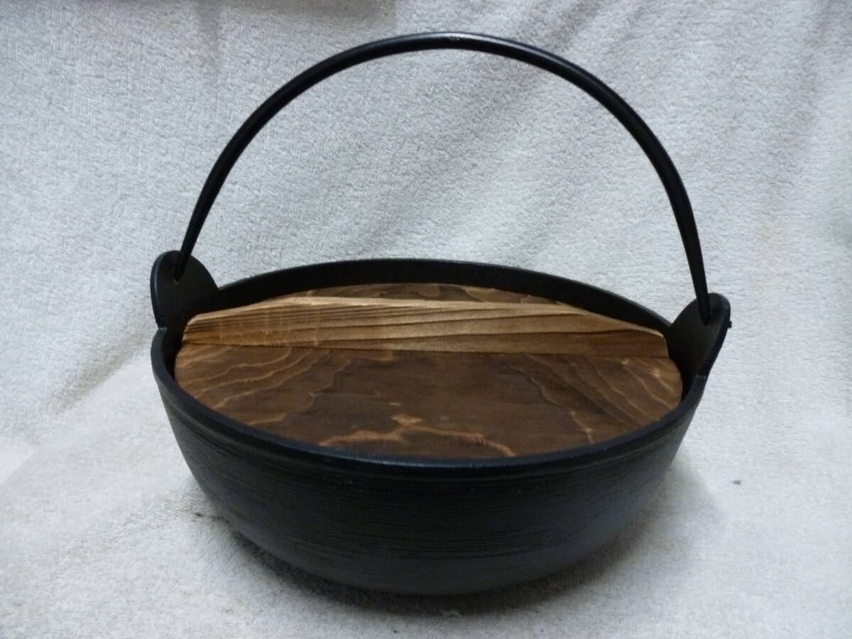 - ◆中古扱い 変色有 良品 保管品 元箱無 すき焼き鍋 黒 内径 約23cm 木蓋付◆伝統工芸 レトロ アンティーク