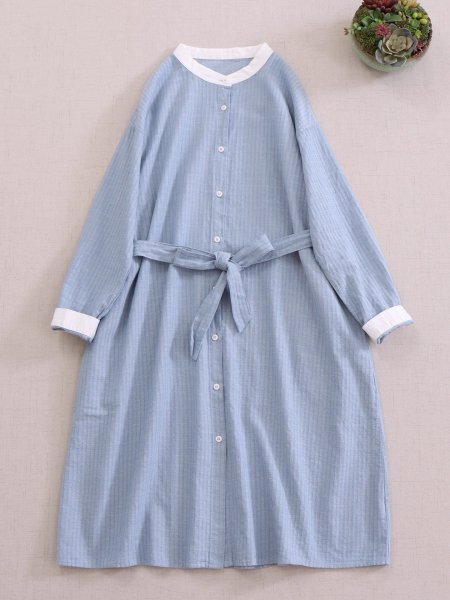 - lb 0708 カーディガンシャツワンピース Aライン フリーサイズ チュニック トップス ナチュラル 綿100% 大人可愛 ストライプ柄 水色