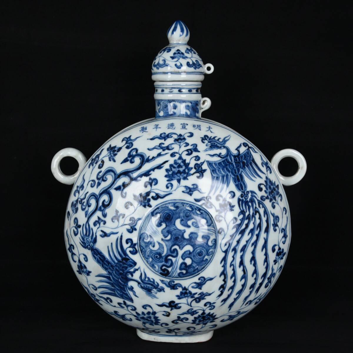 - 『館蔵珍品 明 宣德年製款 古陶瓷品 青花 纏枝雙鳳紋 雙耳扁瓶 陶藝』稀少珍蔵品 古賞物 貴重物品 収蔵品 中国古美術 時代物 古董品