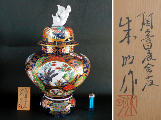- 藤井 朱明 極上染錦木甲割花鳥図 獅子 飾壷