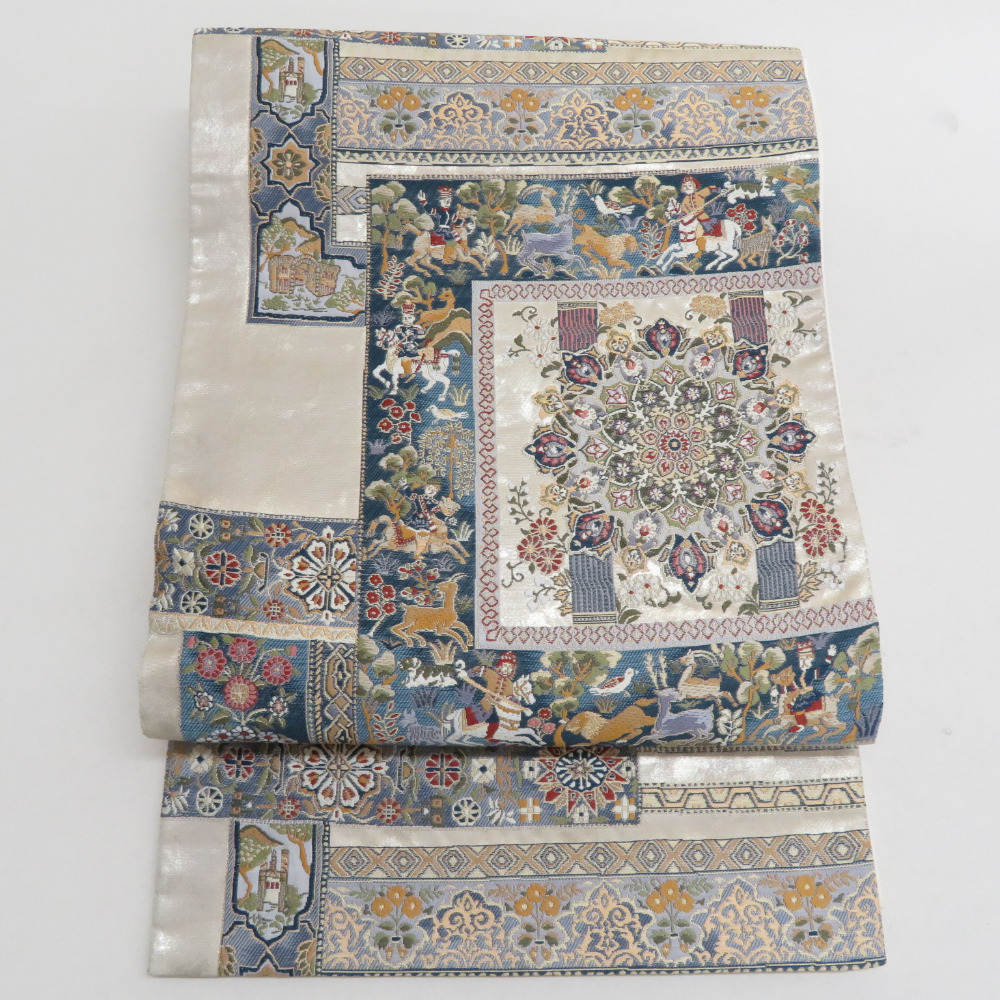 > 袋帯 北欧壁画文様 六通柄 金糸銀糸 エスニック調 ベージュ色x緑色x青色x多色 正絹 仕立て上がり 長さ440cm