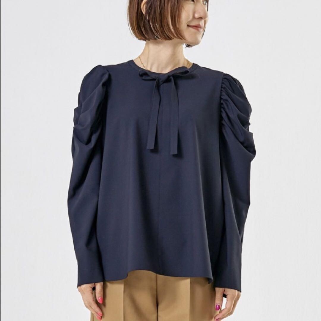 - LA7175 yori ヨリ 長袖 ブラウス ネイビー フロントリボン ギャザー パフスリーブ袖 デザインブラウスポリエステル 36