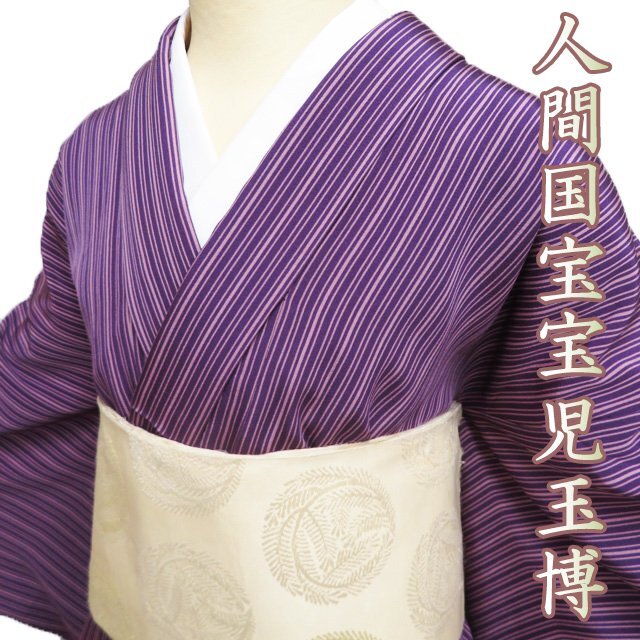 > 特選 小紋 江戸小紋 着物 中古 正絹 袷 人間国宝 児玉博 落款 両子持ち縞 葡萄色 紅藤色 身丈168cm 裄70cm L トール きもの北條 A1251-1