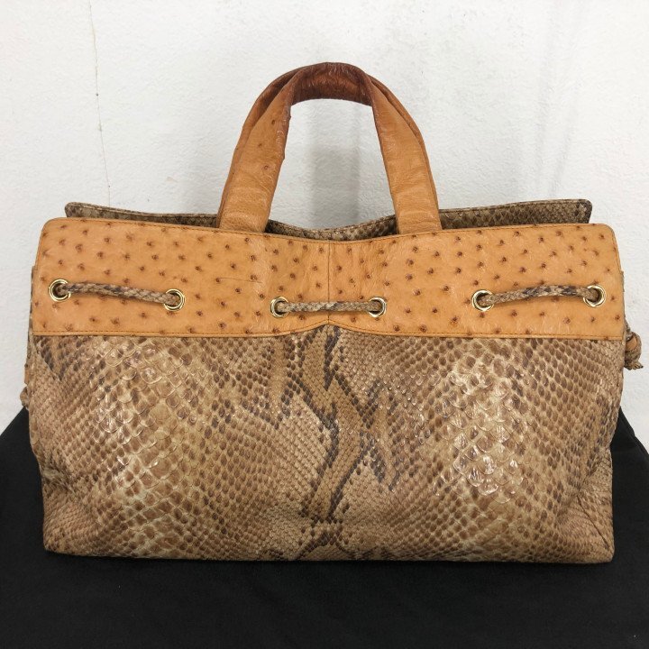 - パイソンレザー × オーストリッチ ヘビ革 ダチョウ革 エキゾチックレザー JRA 内タグ有 ハンドバッグ トートバッグ LU632025080301