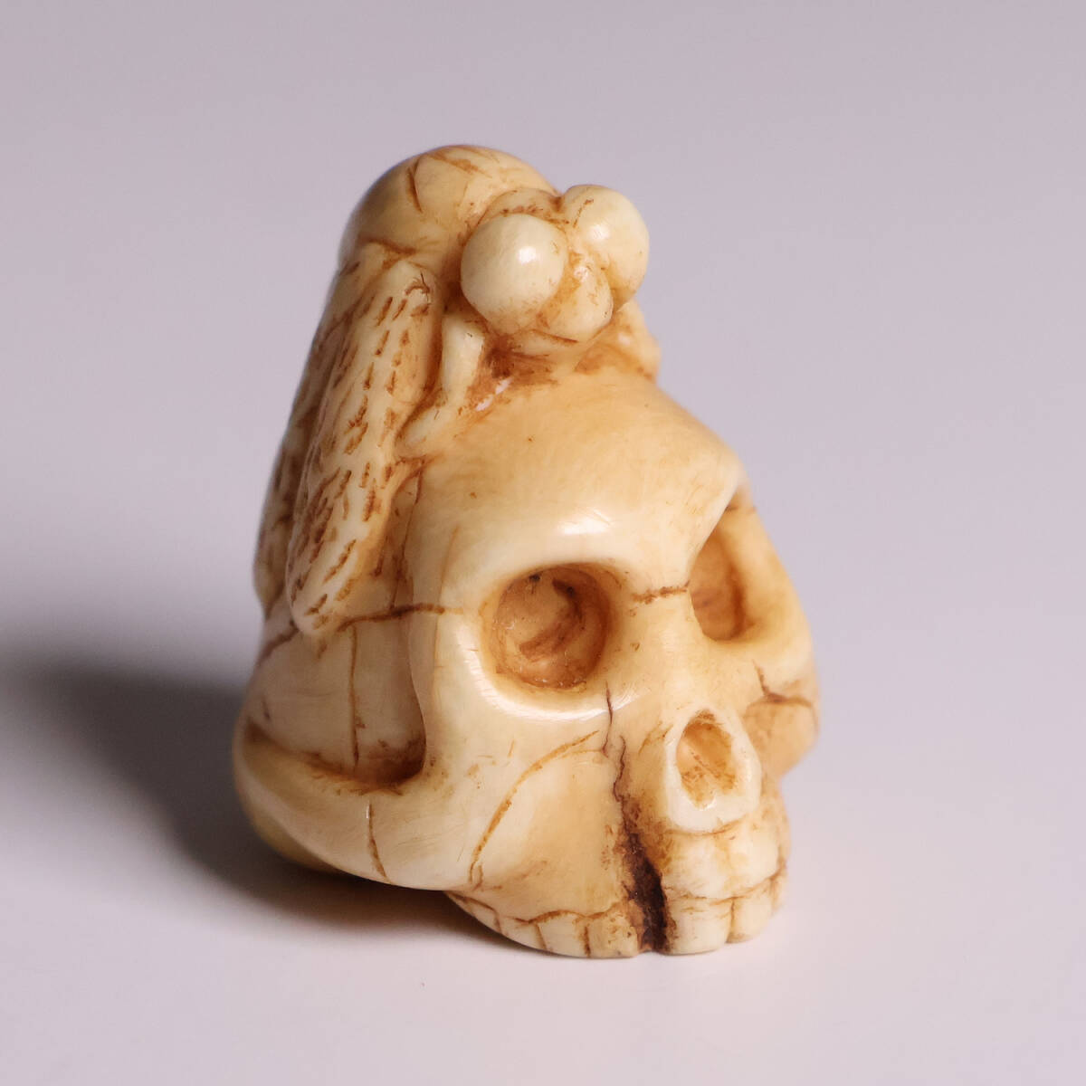- 時代 堤物 根付 髑髏 蜻蛉 牙彫 ドクロ 骸骨 しゃれこうべ トンボ 彫刻 提げ物【CM260】