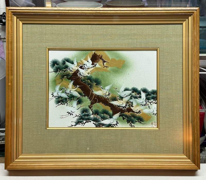 - お勧め 九谷焼 九谷 泉八 色絵らくだ陶板 アート 額 松 鶴 金彩 額サイズ:42.5cm x 35.5cm 陶板サイズ: 24cm x 17cm 保管品 です