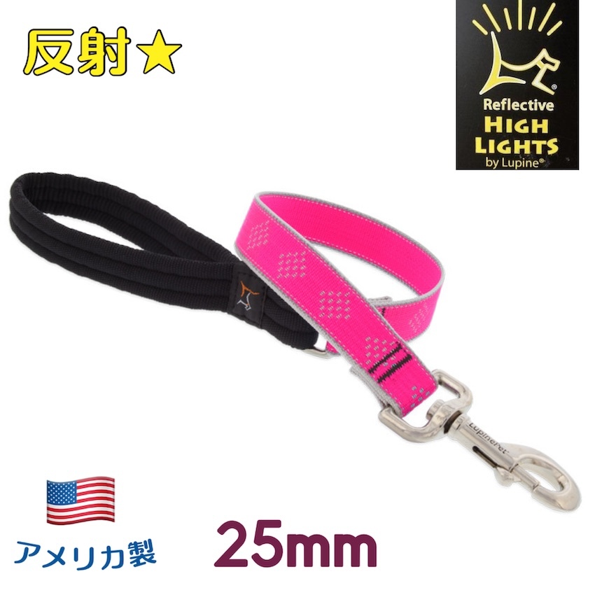 > 60cmショートリード 反射ピンクダイヤモンド柄 25mm幅 LUPINEルパイン パッド付き アメリカ製 軽量丈夫 Reflective High Lights