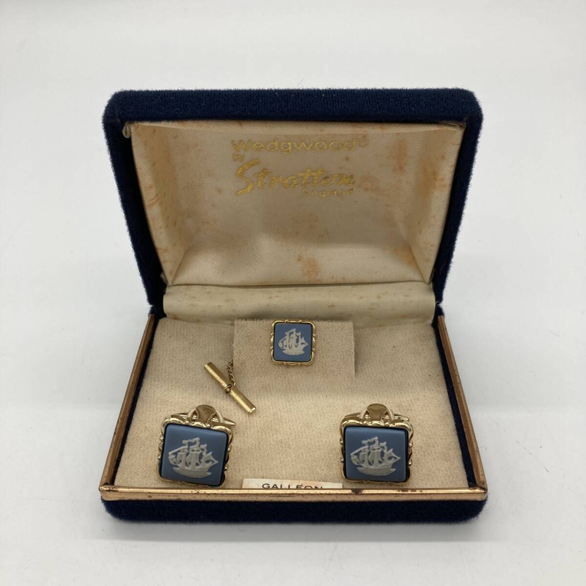 - tt15736 ☆美品☆ウェッジウッド カフスボタン タイピン 3点セット 帆船【GALLEON】 ブルー