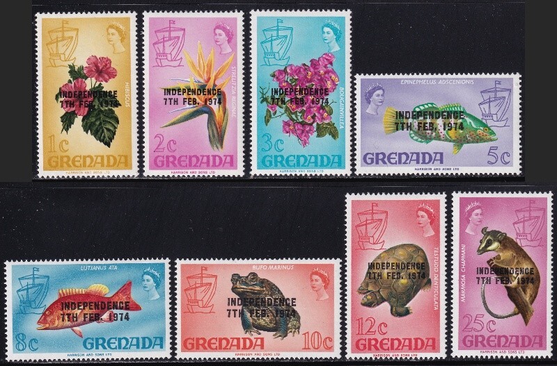 - ak6386 グレナダ 1974 独立加刷 14種完 $2はしみあり #528-41