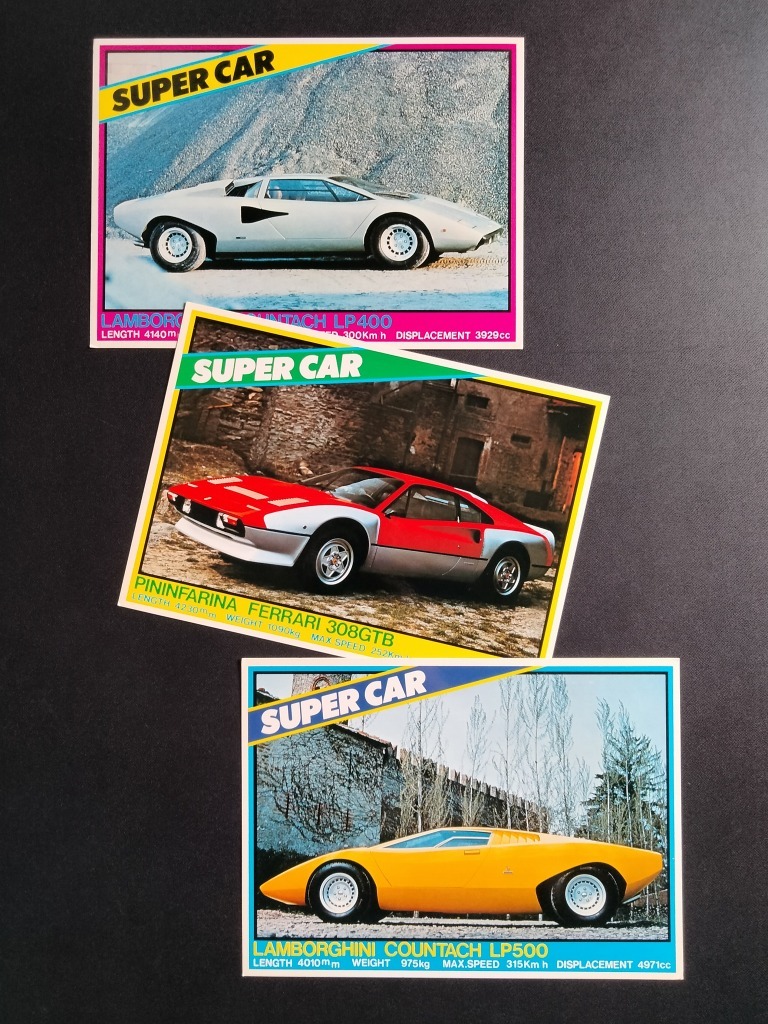> '70s SUPER CAR 当時物 スーパーカー 大判カード 未使用 3枚セット !! ☆ カウンタック LP500プロト & LP400 フェラーリ 308GTB 旧車 A.