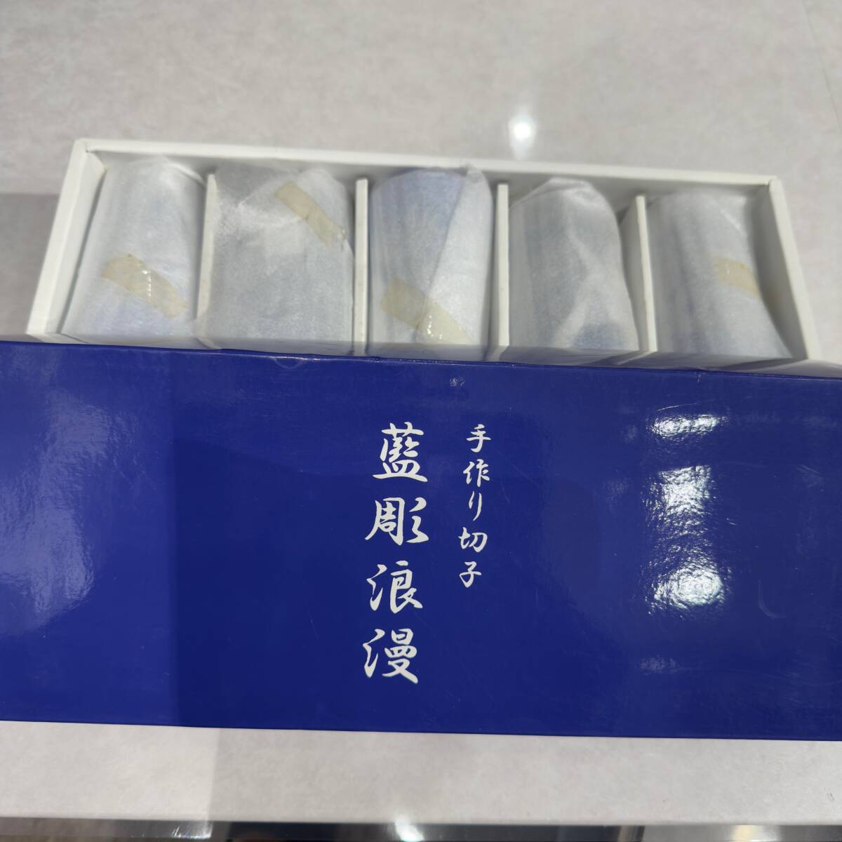 - ●H7-8-16 手作り切子 藍彫浪漫 ブルー グラス5コセット 未使用 保管品