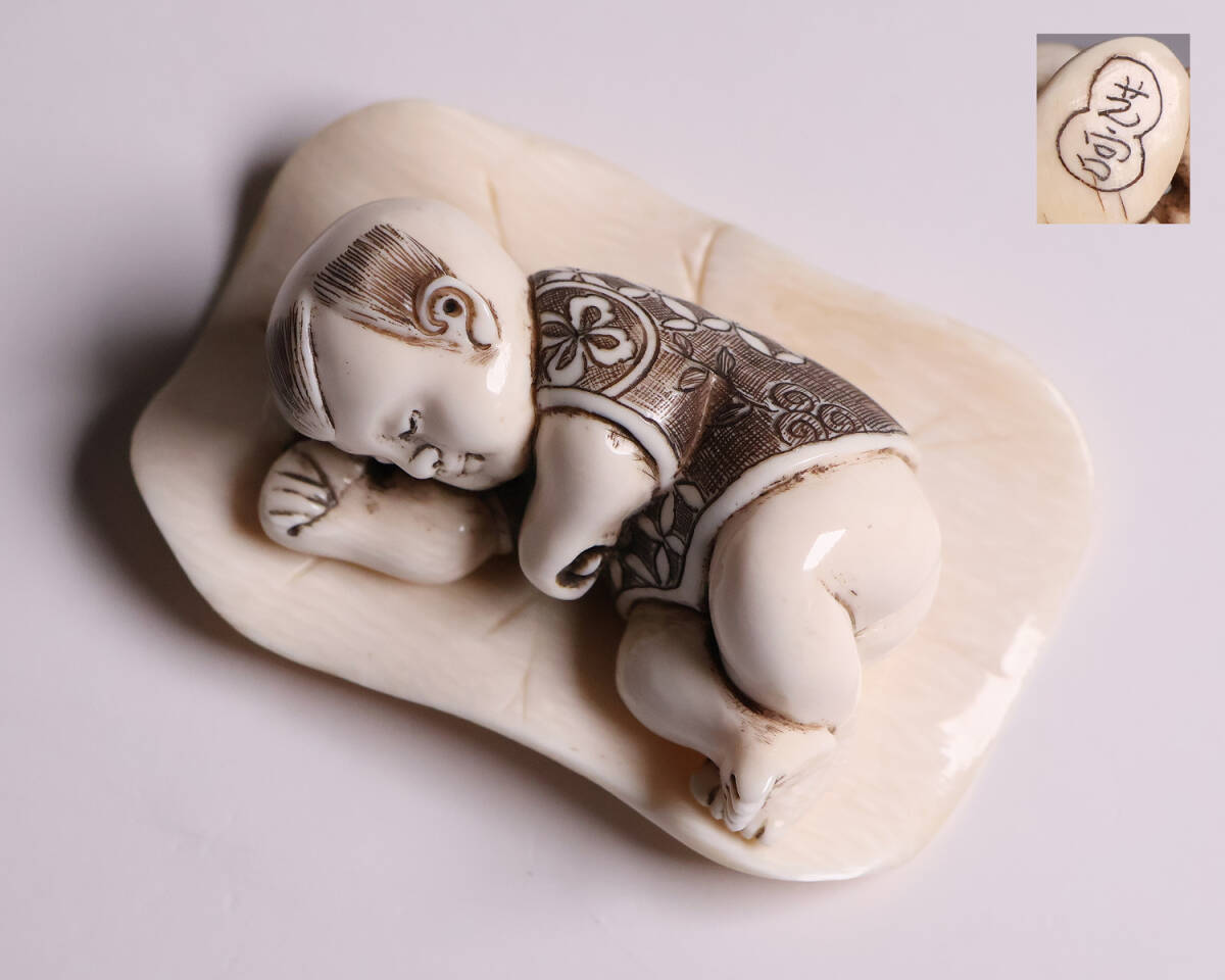 - 時代 眠る唐子 置物 天然素材 在銘 芝宮 牙彫 白材 子供 人物 彫刻【CM274】